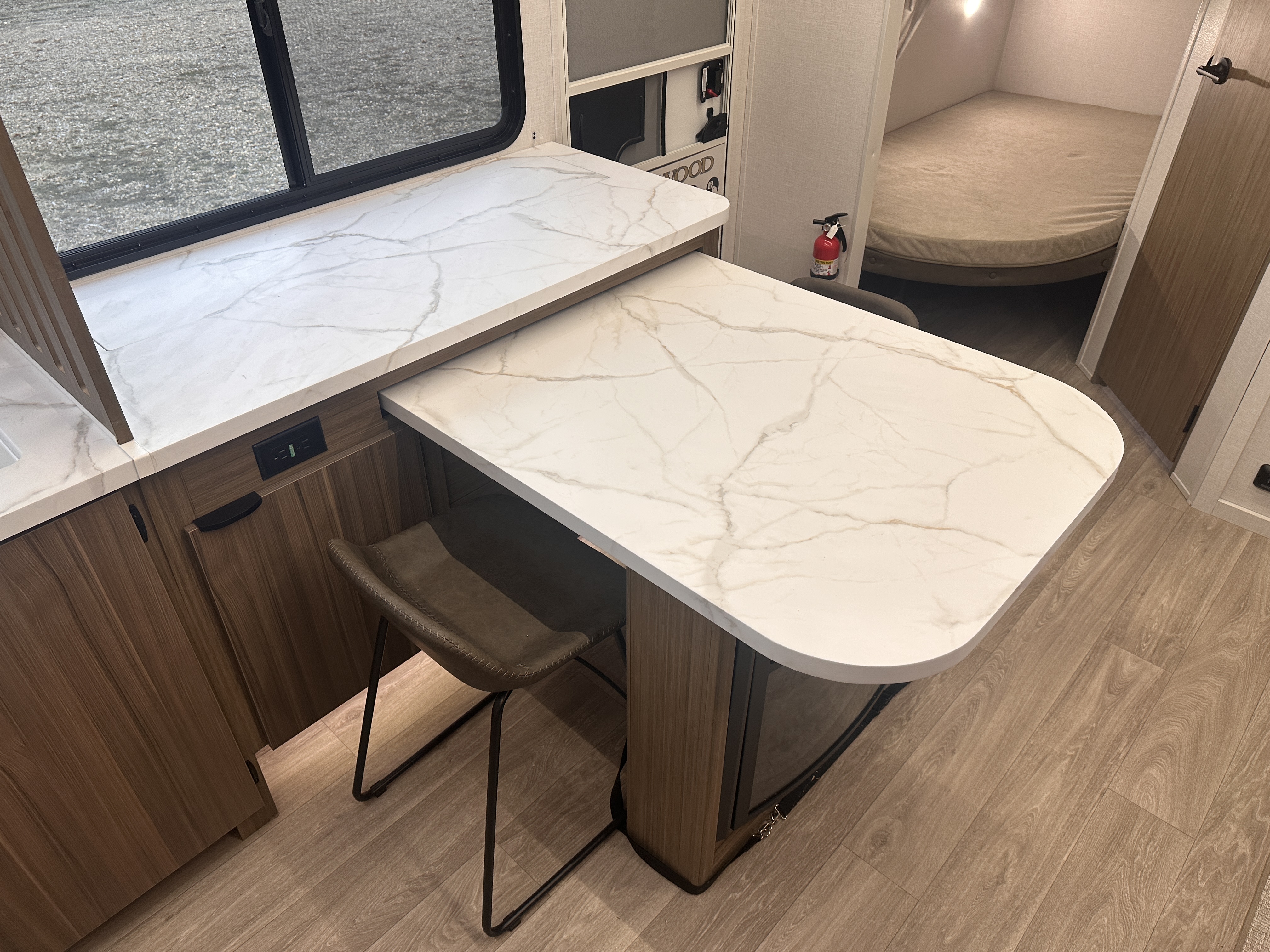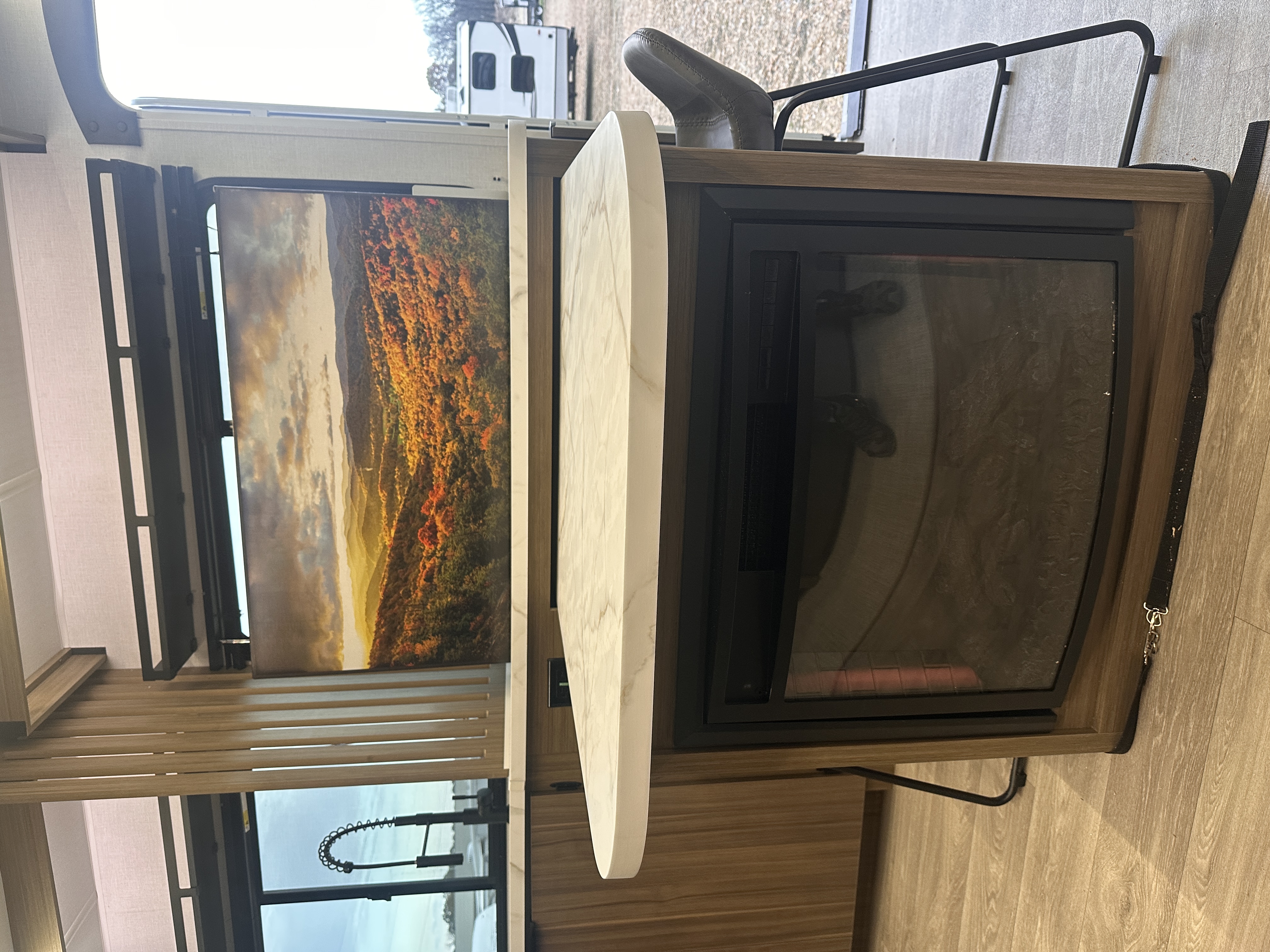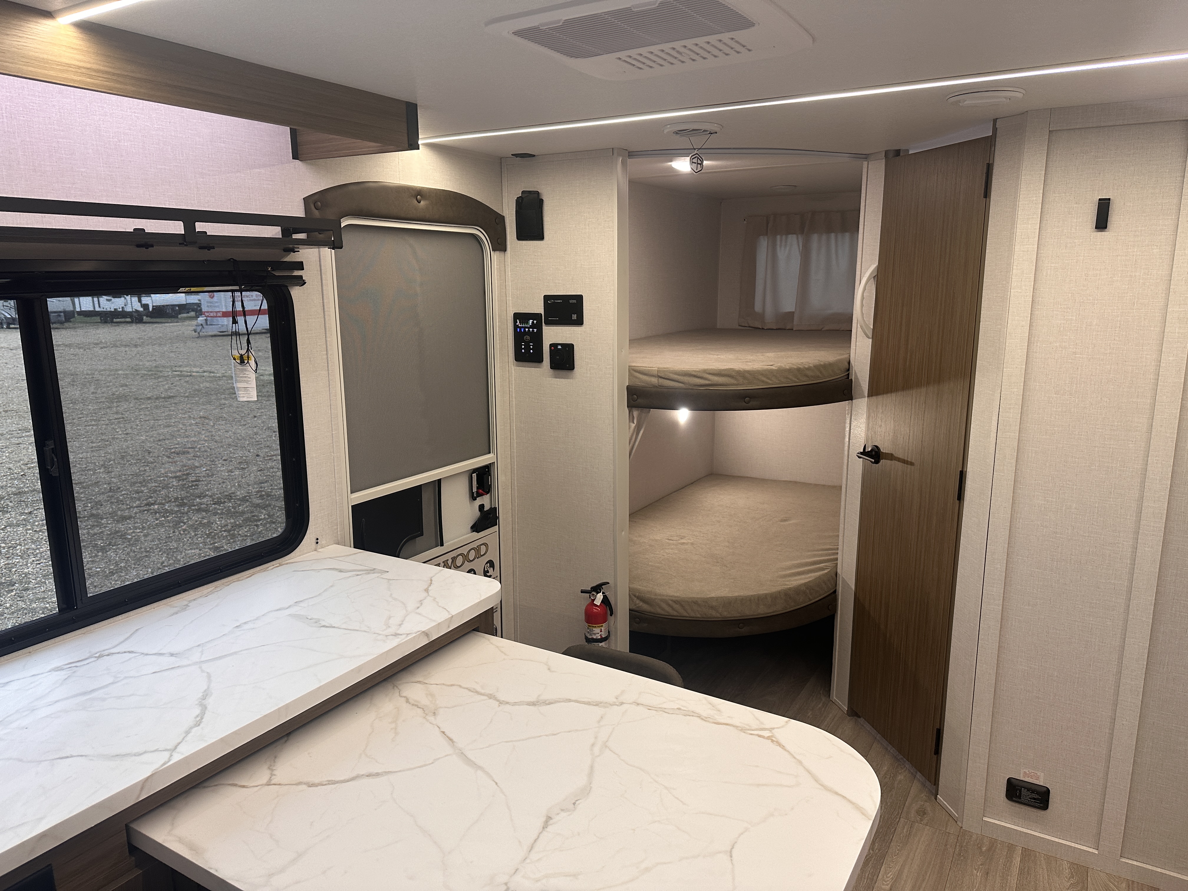 ### Spacious, Family-Ready Interior Step inside and enjoy a thoughtfully designed living space with modern décor, upgraded furnishings, and expansive room to relax. The open floorplan offers: A large slide-out for increased living area Plush seating perfect for movie nights or relaxing after the trail A versatile entertainment center option Plenty of natural light thanks to oversize panoramic windows